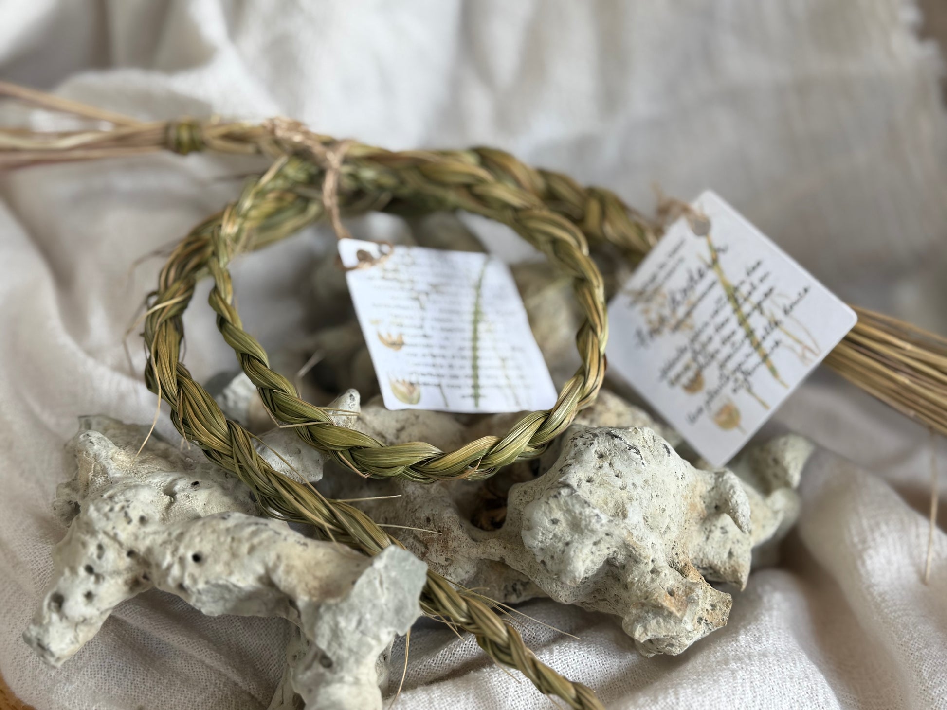 La tresse de foin d`odeur traditionnelle est compose de 21 brins, les 7 premiers brins représentent les 7 générations qui nous ont précédées et ont contribue a faire de nous ce que nous sommes. Les 7 brins suivant symbolises les 7 enseignements sacres : l'Amour, le respect, l'honnêteté, le courage, la sagesse, la vérité et l'humilité. Les 7 derniers bruns représentent les 7 générations a venir, nos enfants et les autres futur. comme le dit un proverbe : nous n'héritons pas de la terre de nos ancêtres, nous l'empruntons a nos enfant.